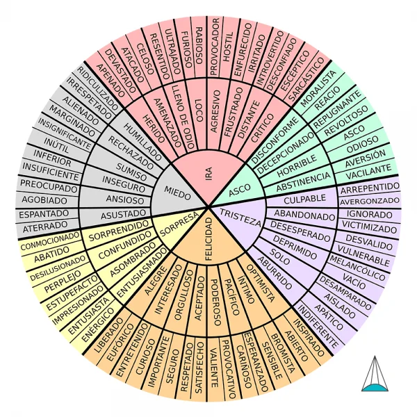 Algunas de las emociones principales que aparecen en la rueda de emociones son:
